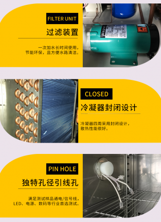 性能指標符合GB5170、2、3、5、6-95《電工電子產品環境試驗設備基本參數檢定方法低溫、高溫、恒定濕熱、交變濕熱試驗設備》的要求